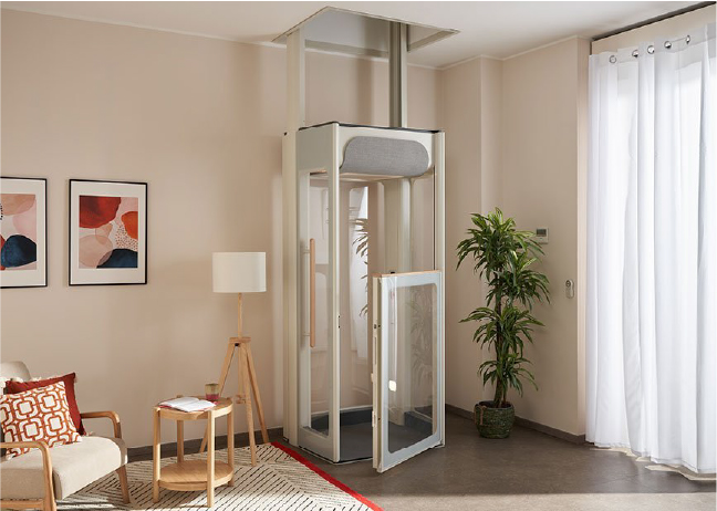 Un diseño sobrio y elegante que no solo se adapta perfectamente al hogar, sino que también lo mejora: materiales agradables al tacto, rieles integrados en la cabina y sistema de transmisión por cuerda para un viaje cómodo y una gestión optimizada del espacio.