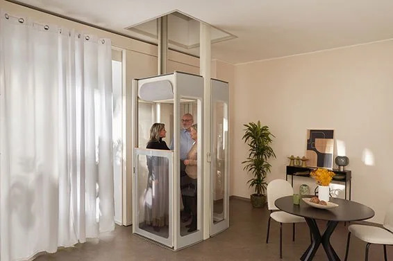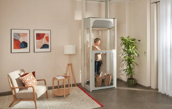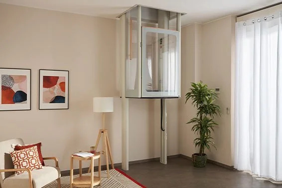 Un diseño sobrio y elegante que no solo se adapta perfectamente al hogar, sino que también lo mejora: materiales agradables al tacto, rieles integrados en la cabina y sistema de transmisión por cuerda para un viaje cómodo y una gestión optimizada del espacio.
