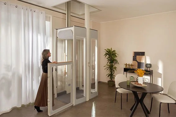 Los ascensores no solo se integran perfectamente con la casa, sino que también ofrecen el máximo espacio en la cabina, gracias al ingenioso sistema de raíles que integran.